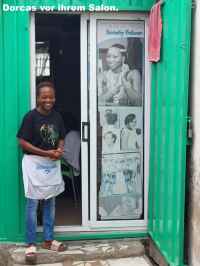 In Ashaiman, einem Slumgebiet von Accra, hat sich Dorcas nach abgeschlossener Friseurausbildung mit einem winzigen Friseur-Salon selbständig gemacht. Während der Zeit ihrer Ausbildung wurde sie von Anidaso Ghana e. V. unterstützt und kann nun selbst für ihren Lebensunterhalt sorgen. Wie immer strömten in kurzer Zeit unzählige Kinder aus der Umgebung heran, denn nur selten wagen sich Europäer ins Gewirr der Hinterhöfe und Gassen. Sie alle freuten sich über den unerwarteten Besuch und über Kekse, die wir für sie bei einer vorbeikommenden Straßenhändlerin kauften.