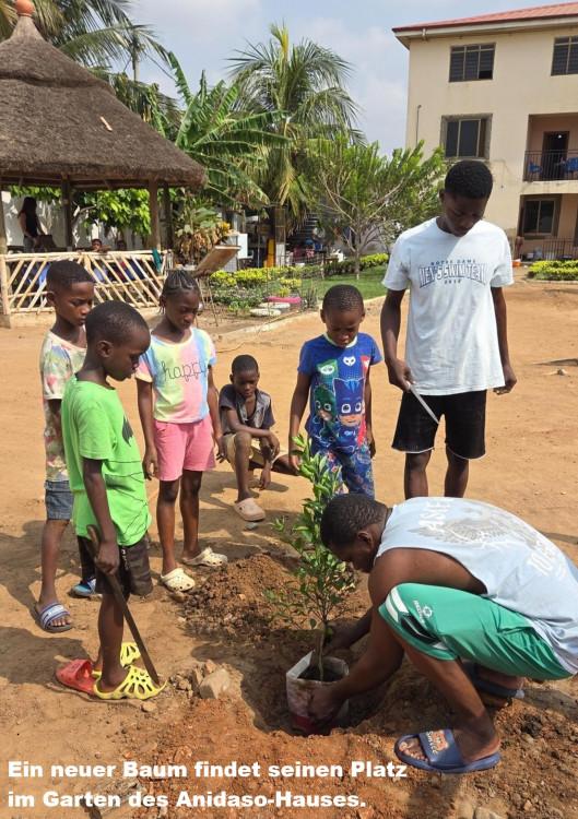 Zum Abschluss der Reise pflanzten wir gemeinsam mit den Kindern im Garten des Anidaso-Hauses einen Mandarinenbaum, der den Hühnern und Ziegen in ihrem Gehege Schatten spenden soll und auf dessen Früchte sich die Kinder schon heute freuen.
